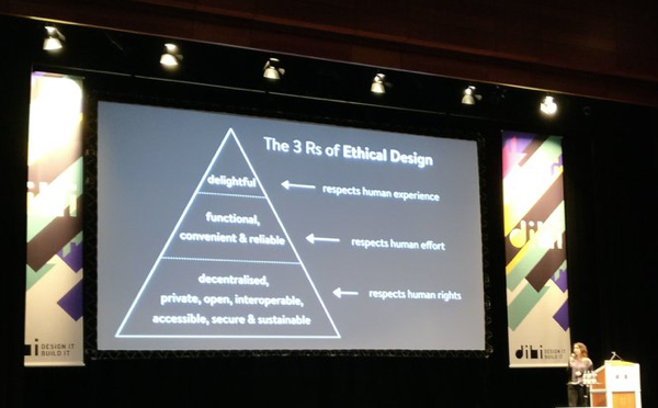 Lauras Appell an uns als die, die das Web mitgestalten und heute die Dinge bauen, die morgen von vielen Menschen genutzt werden, lautete: übernehmt Verantwortung für eure Arbeit, und baut eure Produkte nach ethischen Gesichtspunkten! Dazu haben sie und ihr Partner bei Ind.ie das Ethical Design Manifesto entwickelt, das als ethische Richtlinie für digitale Produkte dienen sollte. Wie sagte sie so schön? "Not worrying about your data is privilege!"