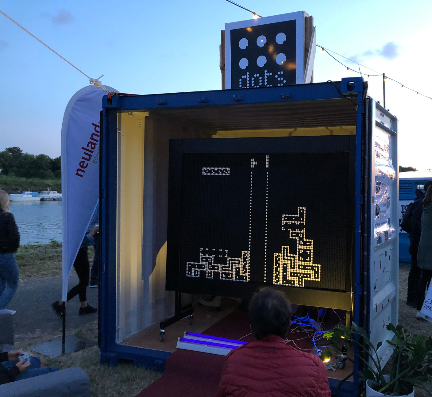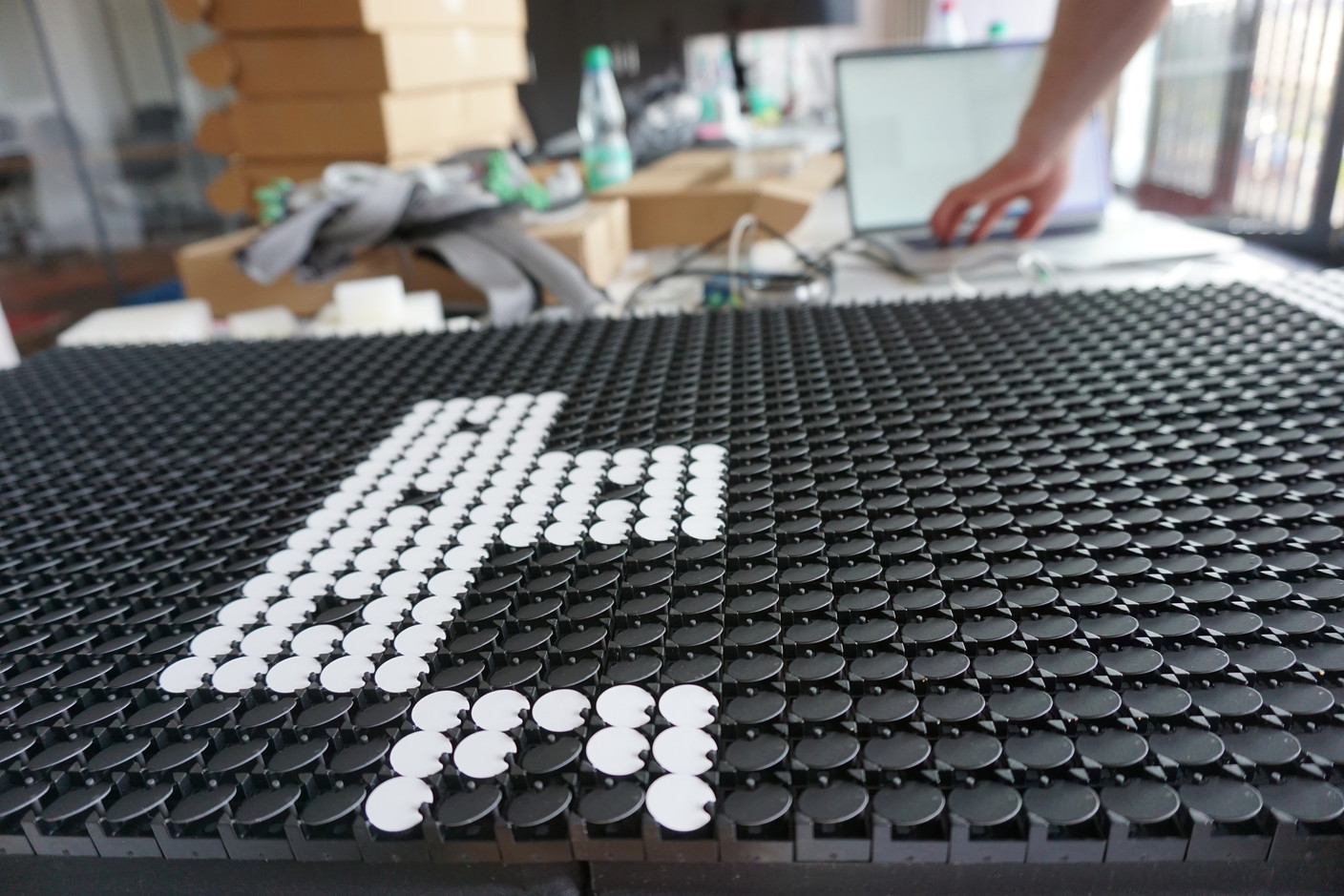 Es handelt sich dabei um ein spezielles Display mit 9.408 kleinen magnetische Plättchen, die die einzelnen Pixel bilden. Diese Plättchen sind auf der einen Seite weiß und auf der anderen schwarz. Nicht nur bei unseren Konferenzen oder Messen ist der Flip-Dot ein echter Publikumsmagnet. Auf der Breminale 2019 konnte über Controller auf unserem Flip-Dot Tetris gespielt werden, welches von einer Gruppe unserer Entwickler:innen programmiert wurde. Gerade die Geräuschkulisse der vielen umklappenden elektromagnetisch-mechanischen Bauteilchen ist ein Erlebnis für sich.