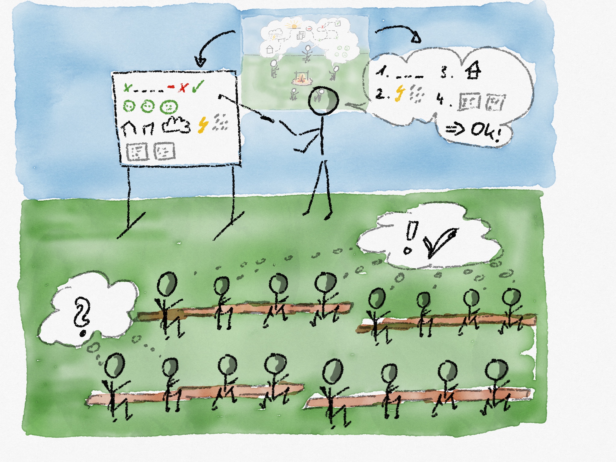 Damit Teams Selbstorganisation praktizieren, ist es notwendig, sie eigene Geschichten erzählen zu lassen. Lebloses Exerzieren vorgegebener Modelle führt genau dort hin. Nämlich zur exakten, automatenhaften Kopie eben dieser. Darum ist der stete Austausch über den zu beschreitenden Weg so wichtig. In der Soziologie nennt man das Diskurs. Wir nennen das "reden".