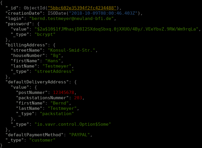 Wir haben dann ein Beispiel-Spring-Boot-Projekt mit MongoDB-Support aufgesetzt. Als Beispiel-Entity haben wir einen Customer gewählt, der u.a. aus einer Rechnungsadresse, einer Lieferadresse, Login, Passwort etc. besteht. Dabei war es uns wichtig, dass das Beispiel mit den Attributen simpel genug für den Innovationstag ist, aber auch komplex genug, um daraus praktisch verwertbare Einsichten zu erhalten und Schlüsse ziehen zu können, z.B. die gesteigerte Lesbarkeit betreffend.