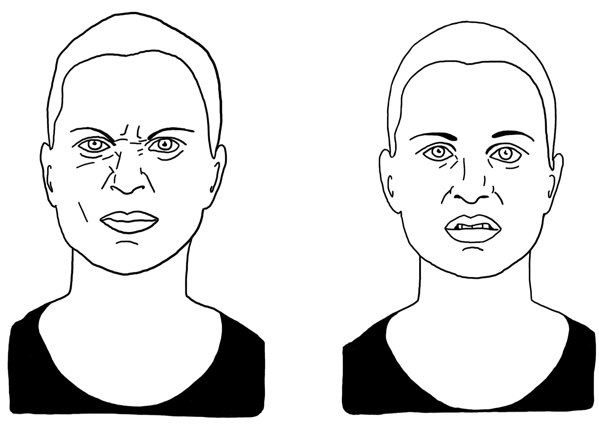 Bei körperlich ausgelöstem Ekel (linkes Bild), d.h. wenn jemand einen ekligen Geruch wahrnimmt oder verdorbenes Essen zu sich nimmt, wird die Nase gekräuselt, wodurch die Augenbrauen nach unten gezogen werden. Die Oberlippe zieht die Person nach oben, die Unterlippe ist ggf. ebenfalls angehoben (vgl. Eilert, Dirk W. (2013), S. 72-73).