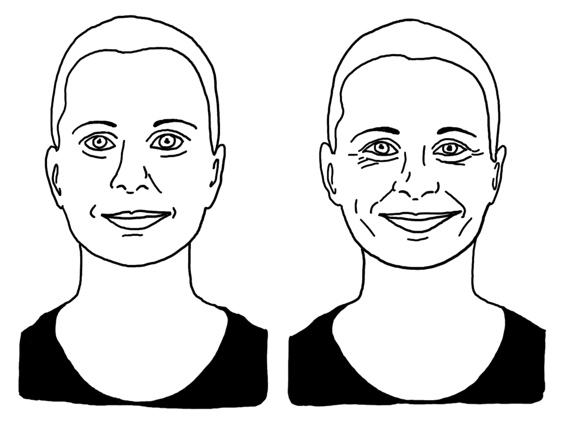 Im Gegensatz dazu geschieht bei echt erlebter Freude (rechtes Bild) noch einiges mehr in der Mimik. Man kann diese Form der Freude daran erkennen, dass die Augendeckfalte abgesenkt wird und manchmal auch die Augenbrauen-Außenseiten. Häufig sieht man kleine Fältchen, die um die äußeren Augenwinkel entstehen. Das ist jedoch kein absolut zuverlässiges Indiz für echte Freude, da die sog. "Krähenfüße" auch durch Bewegen des Jochbeinmuskels allein entstehen können (vgl. Eilert, Dirk W. (2013), S. 78-79).