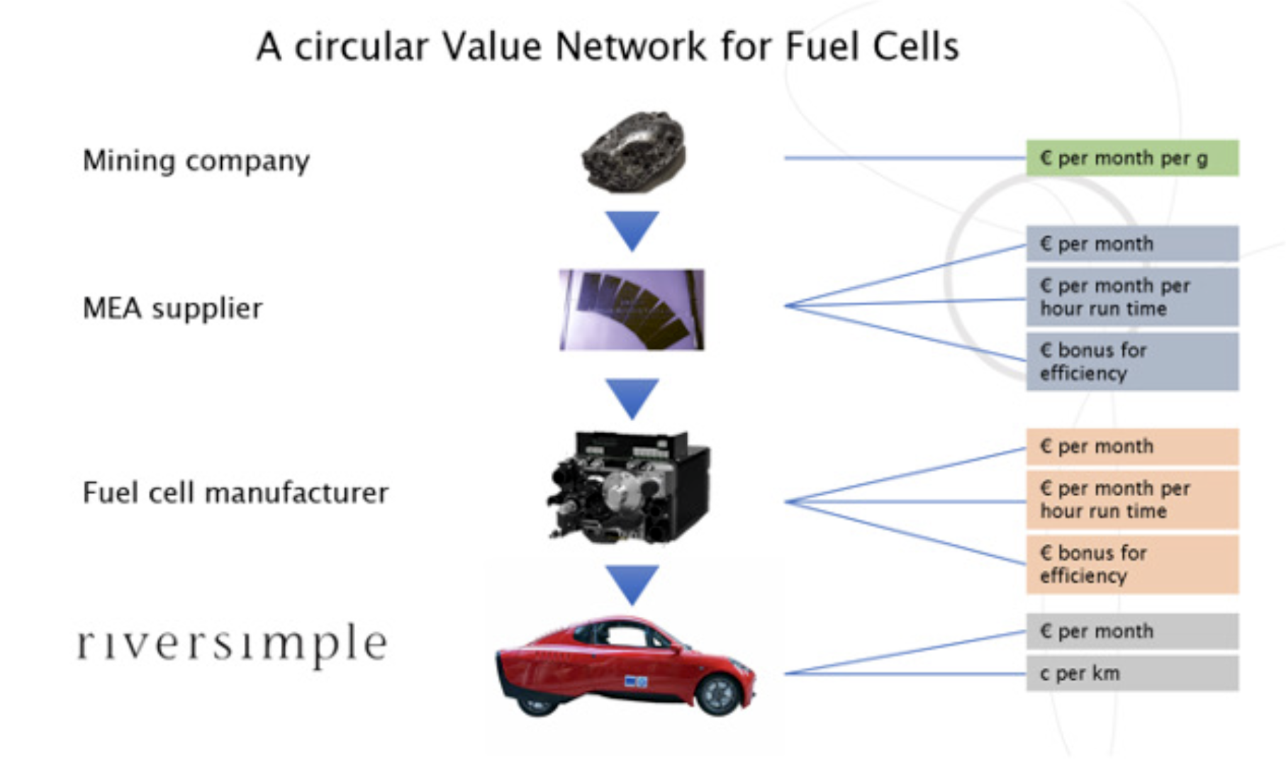 Für seine Wasserstoffzellen hat das walisische Unternehmen z.B. eine Kollaborationskette initiiert, die es als "circular value network for fuel cells" bezeichnet: Riversimple least die Wasserstoffzellen von deren Hersteller. Der Hersteller der Wasserstoffzellen least die darin enthaltenen Membranen. Selbst das in den Membranen enthaltene Platin kann geleast werden, da es nur als Katalysator dient und sich deshalb nicht verbraucht.