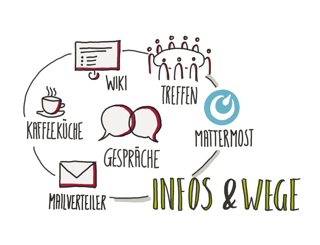 Als internes Chattool nutzen wir Mattermost. Bei Mail-Verteilern nutzen wir Aliase über unsere Usertools, aber auch Verteiler-Listen über Mailman. Hier lohnt sich immer ein Blick, was es schon an Channeln und Listen gibt. Vielleicht ist das Gesuchte bereits dabei oder ihr bekommt eine Inspiration, wo ihr euch gerne beteiligen möchtet.