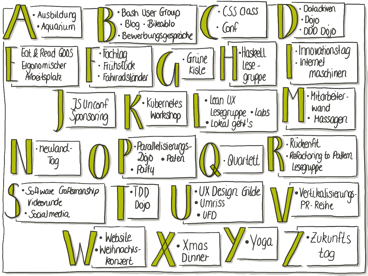 Hier ein paar konkrete Beispiele, was bei neuland durch Engagement der Mitarbeitenden entstanden ist. Die Auflistung ist natürlich nur ein Ausschnitt und die Bandbreite soll euch zeigen: es gibt kaum eine Idee, die man nicht anbringen kann.
