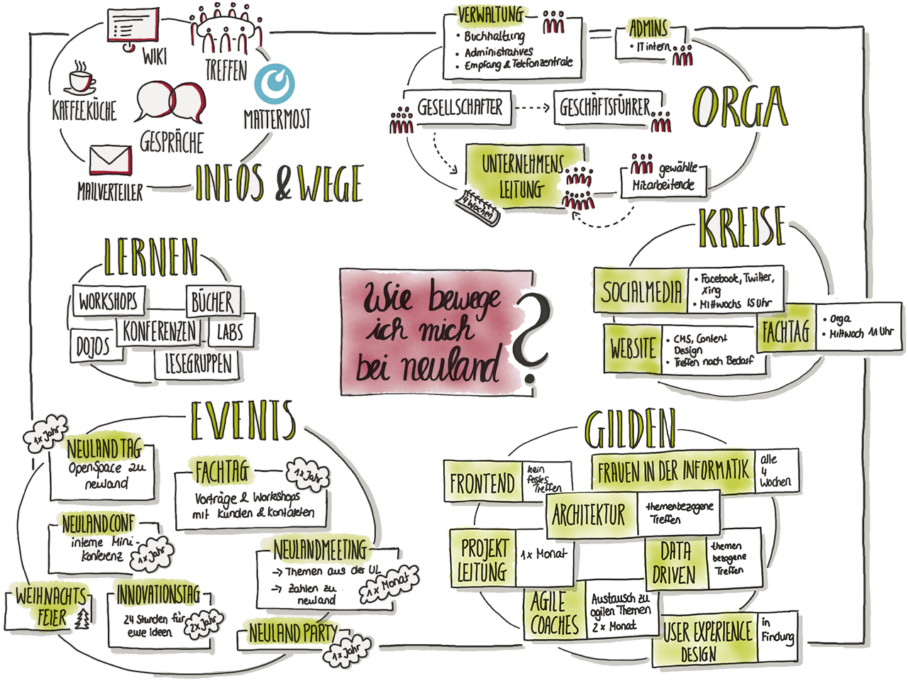 Es ist eine ganze Menge, was bei neuland so nebenbei bewegt und gestaltet wird. neuland ist geprägt durch eine Hands-On-Mentalität und Semi-Professionalisierung. Wer Vorschläge macht, ist auch für die Umsetzung mitverantwortlich. Was bei uns nicht funktioniert, ist das Einbringen von Ideen und die Erwartung, andere würden diese umsetzen. Semi-professionell bedeutet: kaum jemand von uns ist Profi in dem, was sie außerhalb der Kundenarbeit für neuland tut. Das Engagement erfolgt vor allem aus Interesse und dem Erkennen einer Aufgabe, die wichtig für neuland ist, aber bisher von niemandem übernommen wurde. Wir wachsen hier alle mit unseren Aufgaben.