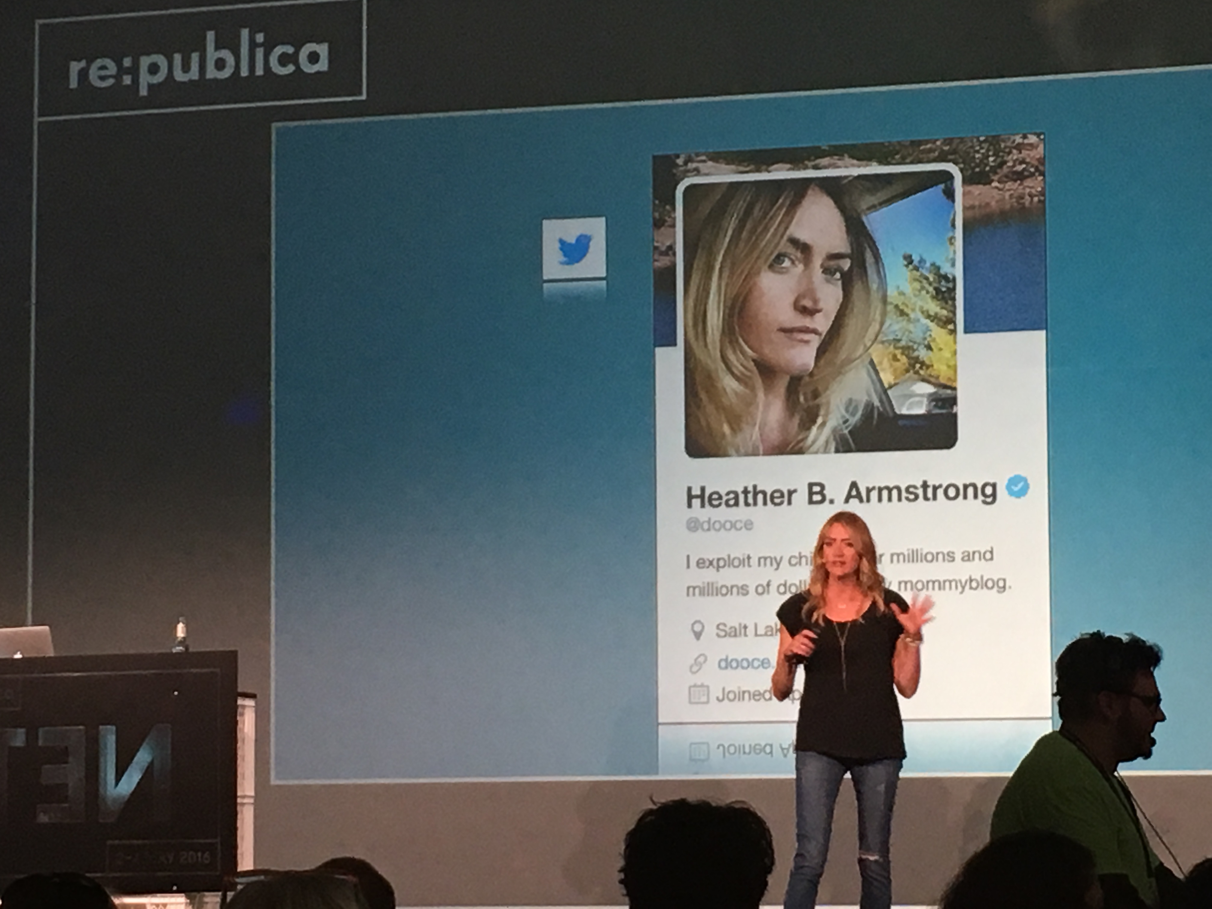Heater Armstrong, die "Queen of the Mommy Bloggers", bloggt seit mehr als zehn Jahren über ihr Familienleben und hat mehr als 1.5 Mio Follower bei Twitter. Mit ihrem Blog dooce.com hat sie einige Preise gewonnen. Zusätzlich berät sie Unternehmen bei Online-Kampagnen und spricht auf vielen Konferenzen. Auf der re:publica berichtete sie über ihre Art, mit Kritik und Hasskommentaren umzugehen. Ihre Session steht online zur Verfügung.