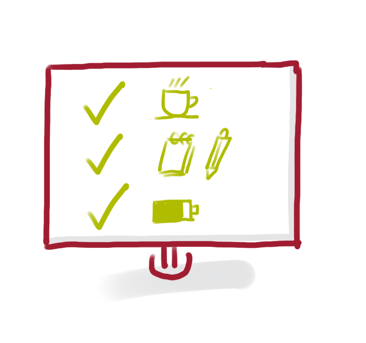 Da einige Video-Tools sehr viel Strom verbrauchen, sollten deine Akkus von Notebook und Handy ausreichend geladen sein oder ein Ladekabel parat liegen. Mindestens fünf Minuten vor Start des Meetings solltest du den Raum aufmachen und startklar für die Begrüßung der Teilnehmenden sein.