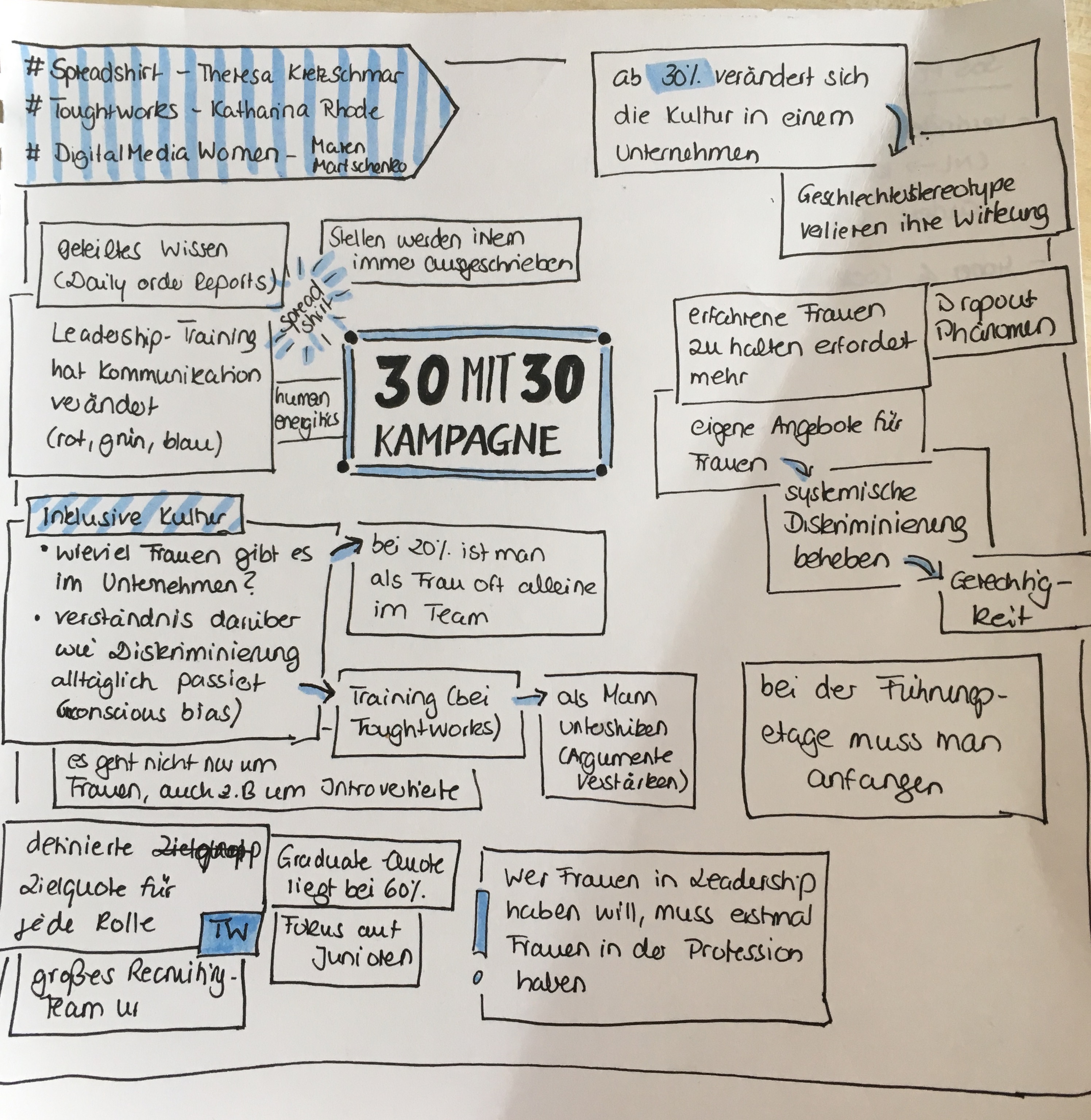 Die Digital Media Women suchen mit ihrer Kampagne 30 Unternehmen, die erfolgreich daran gearbeitet haben, ihren Frauenanteil in Führungspositionen auf 30% zu erhöhen. Theresa Kretzschmar von Spreadshirt und Katharina Rohde von ThoughtWorks diskutieren gemeinsam mit Maren Martschenko von DigitalMediaWomen, welche Vorgehensweisen dabei funktionieren, was erste Schritte sein können und welche Veränderungen stattfinden.
