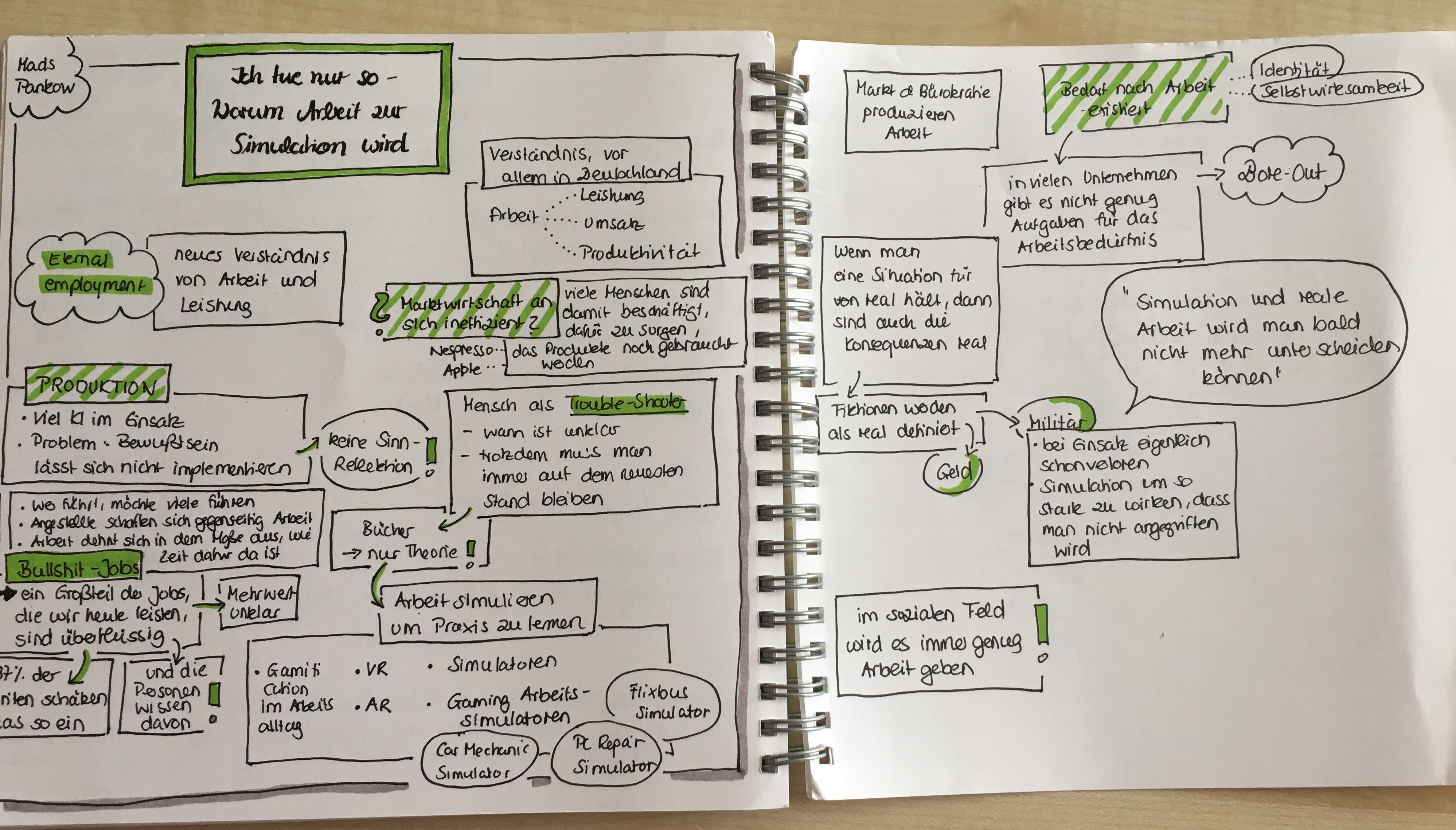 Zum Einen ist ein Großteil der Jobs, die wir heute leisten, überflüssig. Die Marktwirtschaft und Bürokratie erzeugen immer mehr Bullshitjobs. Doch lassen sich die Jobs nicht einfach abschaffen, denn der Bedarf nach Arbeitstätigkeit existiert - Menschen verbinden damit Identität und Selbstwirksamkeit. Aber viele Unternehmen haben nicht genug Arbeit für das vorhandene Arbeitsbedürfnis. In der Zukunft wird auch ein simulierter Arbeitstag zu Zufriedenheit führen.