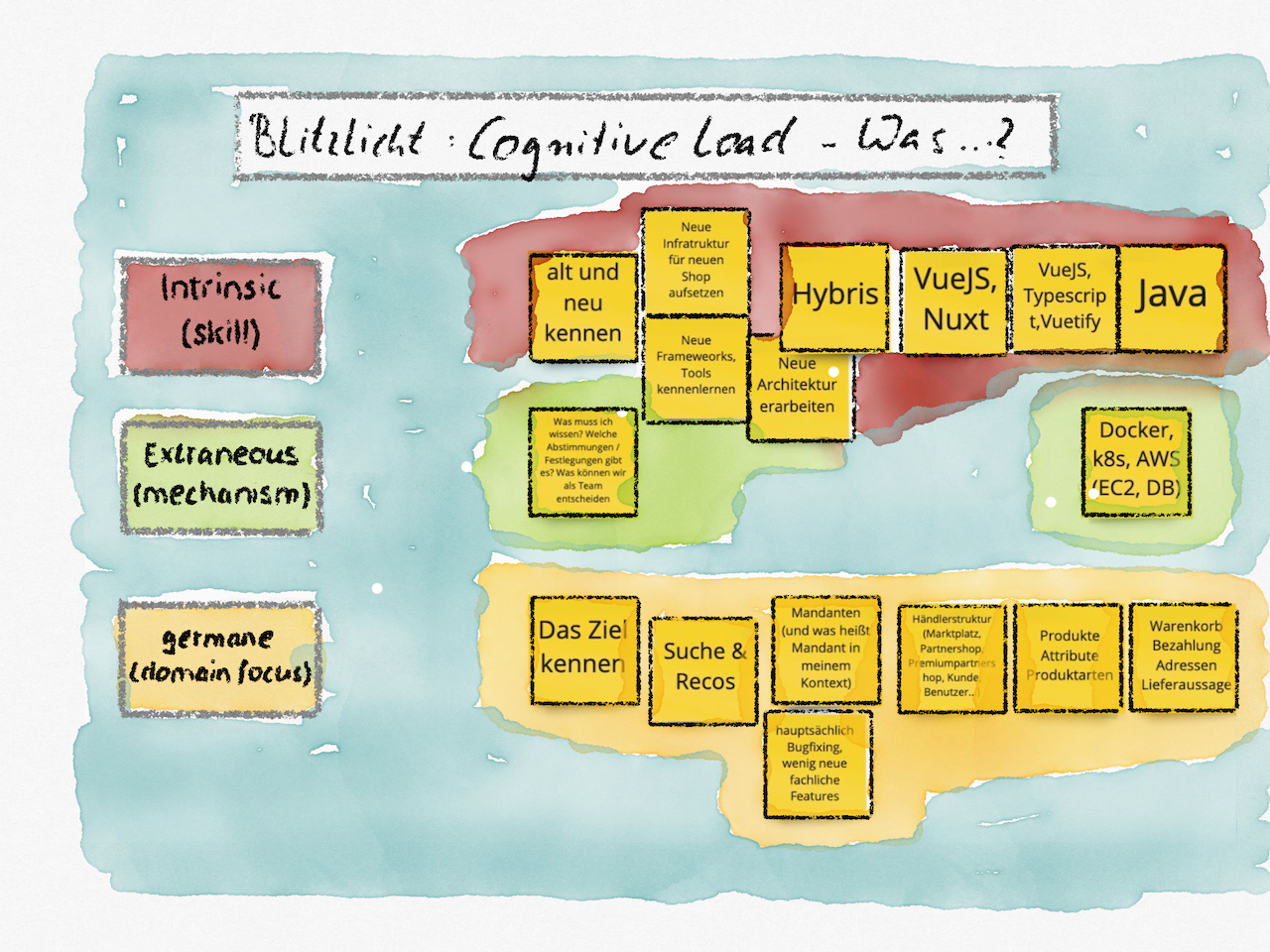 Die kognitive Last bei wissensbasierter Arbeit, wie der Softwareentwicklung, wird in drei Dimensionen differenziert: Erstens eher handwerkliche Basis-Wissenslast, die bewältigt werden muss, um die eigene Aufgabe zu erfüllen (intrinsic / skill). Zweitens die infrastrukturell verursachte Wissenslast, die sich aus dem technisch/organisatorischen System ergibt, in dem das Team sich bewegt (extraneous / mechanism) und – drittens und zentral für uns – die fach-domänenspezifische Wissenslast, ohne die die eigenen Fähigkeiten nicht kundenorientiert eingesetzt werden können (germane / domain focus).