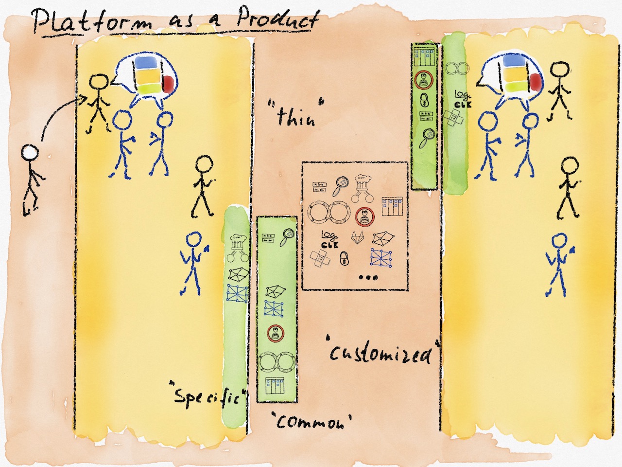 Um das Mindset zu entwickeln, empfiehlt sich auch hier eine Ergänzung: hinter platform-as-a-product steht das Pattern der thinnest viable platform und des just big enough. Ist der Auftrag so formuliert, wirkt er disziplinierend: