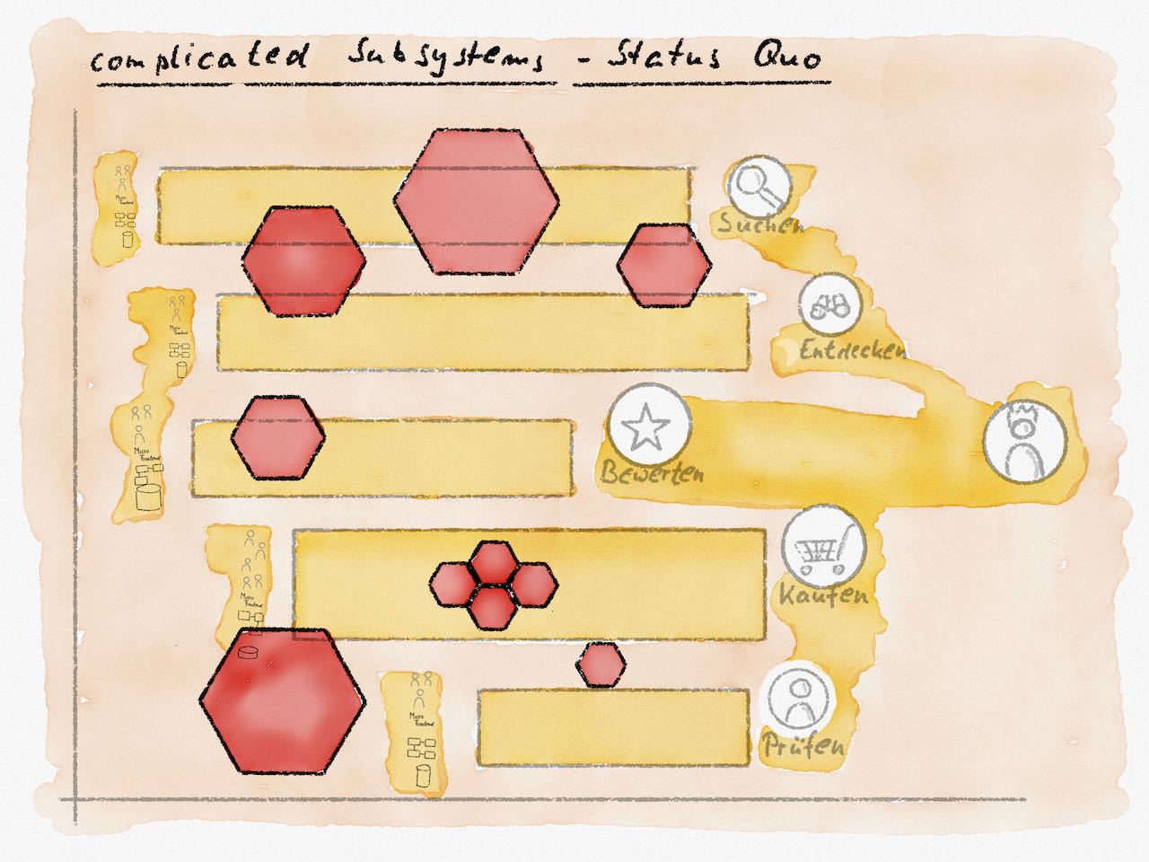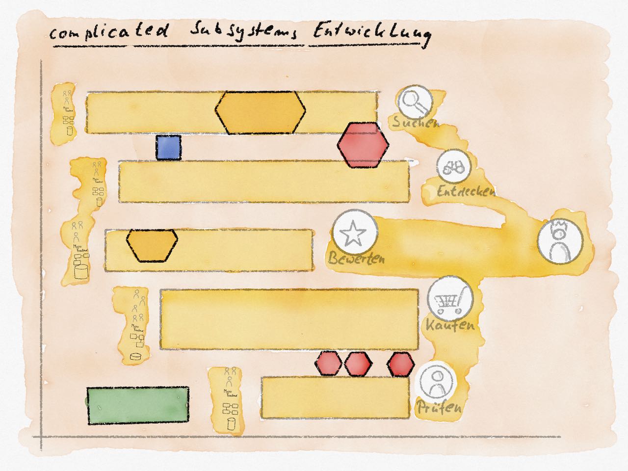 Wenn wir Bestandsaufnahmen von Teams und Systemen machen und im Rahmen von Vertikalisierungsdiskussionen über die vermutlich sinnvollen Team Topologies sprechen, wird das rote Sechseck anfangs häufig verwendet.
