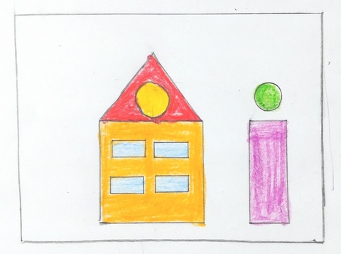 User Story A: Malt ein Quadrat. Darüber ein Dreieck. In dem Quadrat sollen rechteckige Löcher sein. Im Dreieck ein kreisrundes Loch. Rechts daneben ist ein Zylinder, auf dem oben ein Kreis positioniert ist. Umgeben ist alles von einer Begrenzung. Die Elemente sollen farbig sein.