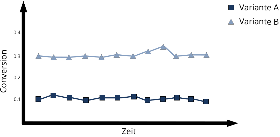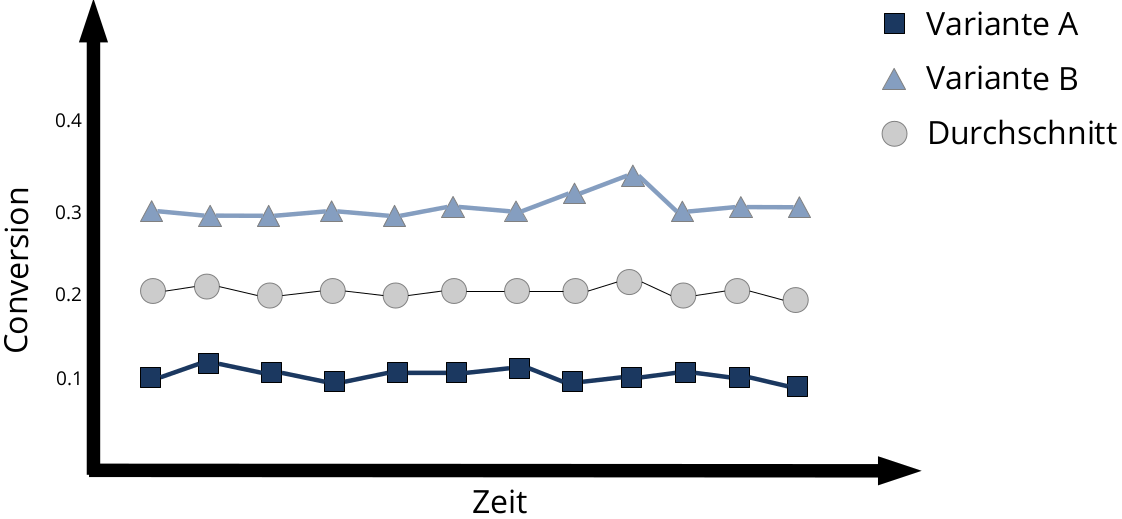 Würden sich beide Varianten einfach abwechselnd zeigen (mit einer 50:50 Chance), erreicht man gemittelt über alle Varianten natürlich nur eine durchschnittliche CVR: