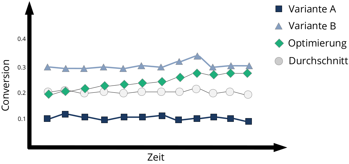Setzen wir jedoch eine Optimierungsstrategie an, nähert sich die effektive Conversion-Rate über die Zeit der bestmöglichen Conversion Rate an - der Algorithmus konvergiert: