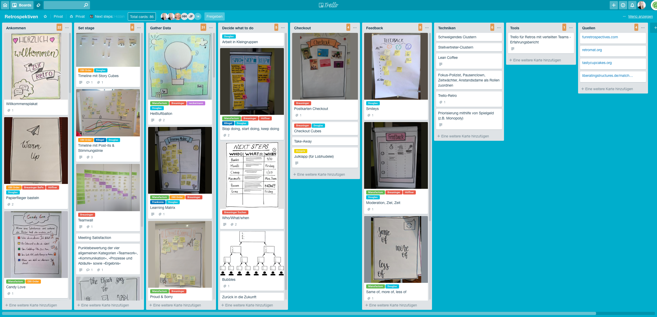 Die Gilde der Agilen Coaches bietet unter anderem die Moderation von Retrospektiven an. Angefangen hat das Board als Ideen-Sammlung und Überblick, welche Übungen in welchen Teams bereits genutzt wurden. Inzwischen sammeln wir hier mit einigen Kolleginnen neue Übungen und Quellen. Die Listen orientieren sich an den einzelnen Phasen der Retrospektive.