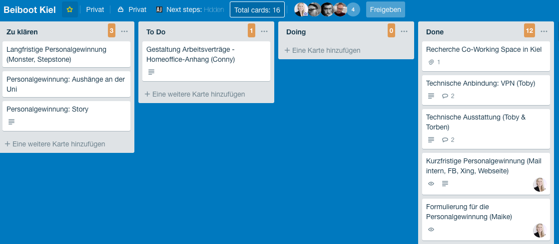 Seit dreizehn Jahren ist neuland in Bremen verwurzelt. Durch den Umzug eines Kollegen nach Kiel entstand das Experiment "Beiboot Kiel". Auf dem Board sammeln wir Aufgaben für den Aufbau des neuen Standortes und sind so über die beiden Orte immer auf dem aktuellen Stand.