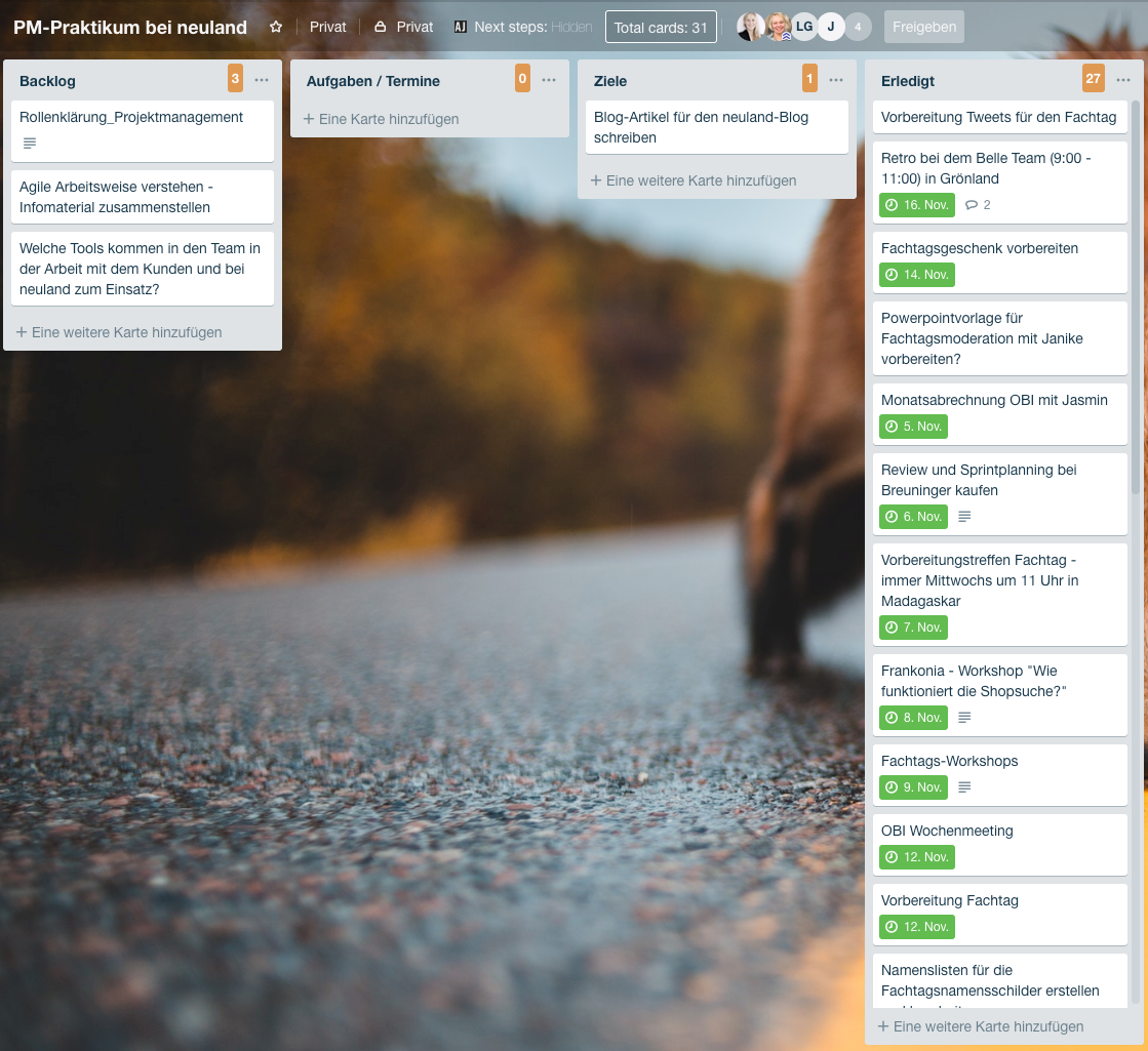 Im Oktober war eine Abiturientin bei uns, um in den Bereich Projektmanagement reinzuschnuppern. Meine Kollegin Christina hatte im Vorfeld Aufgaben gesammelt und die Teilnahme an Terminen in verschiedenen Teams organisiert, sodass Lena einen möglichst vielfältigen Eindruck bekommen konnte. Für den besseren Überblick gab es dafür ein eigenes Board. Da Praktikantinnen nicht immer eine eigene E-Mail-Adresse und darüber Zugang zu allen neuland-Tools erhalten, ein guter Workaround, um gemeinsam mit einem Tool zu arbeiten.