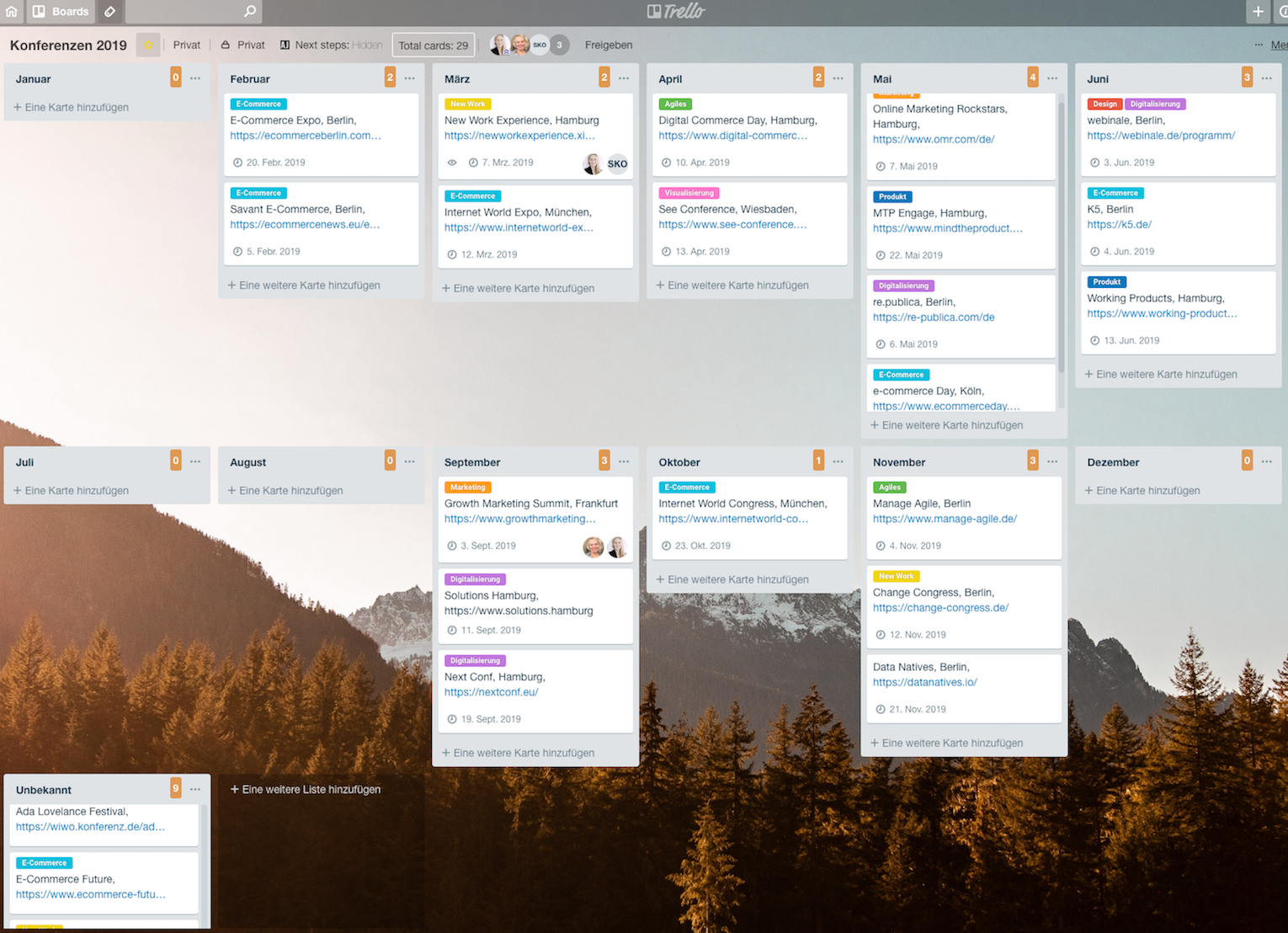 Abseits der typischen Konferenzen entdecken wir immer wieder neue Events. Meisten stoßen wir zufällig auf sie. Damit auch andere davon profitieren, sammeln wir diese in einem Board als Jahresübersicht. Das Filtern nach unterschiedlichen Schwerpunkten wie Agiles, E-Commerce oder New Work ist möglich. Man sieht direkt, welche Kolleginnen sich für welches Event angemeldet haben. Die Listen lasse ich mir bei dem Board untereinander anzeigen, so sieht man das ganze Jahr auf einen Blick. Das ist über ein Add-On möglich (Tipps weiter unten).