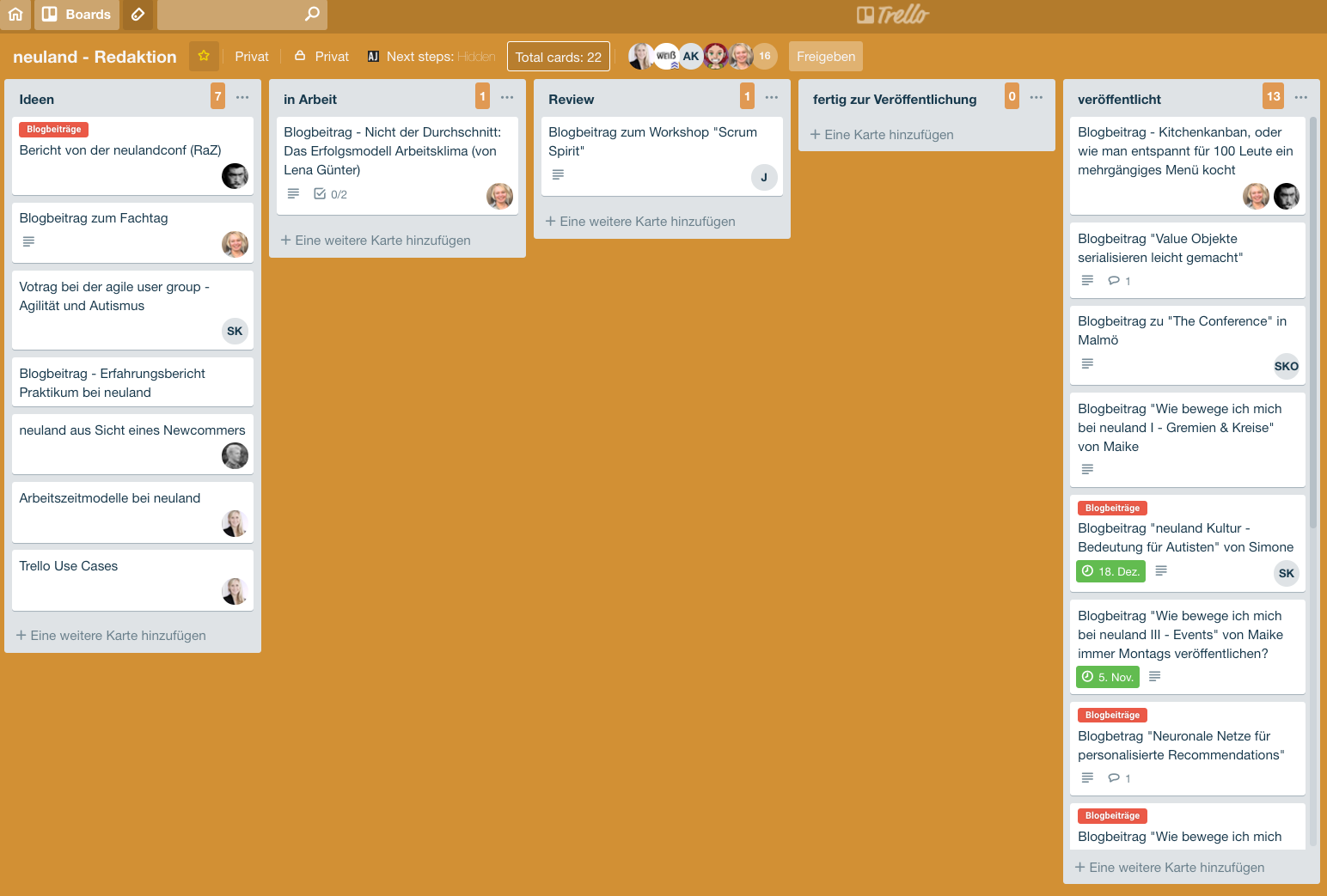 Seit einigen Wochen gibt es zur Koordination von Inhalten für den Blog, aber auch für Vorträge bei Meetups und auf Konferenzen die Gruppe neuland-Redaktion. Zur besseren Übersicht, welche Blogartikel gerade in Arbeit oder bereit zur Veröffentlichung sind, dient das Board. Hier orientiert sich auch das Social Media-Team für seine Planungen zur Veröffentlichung auf Twitter, Facebook und Xing.
