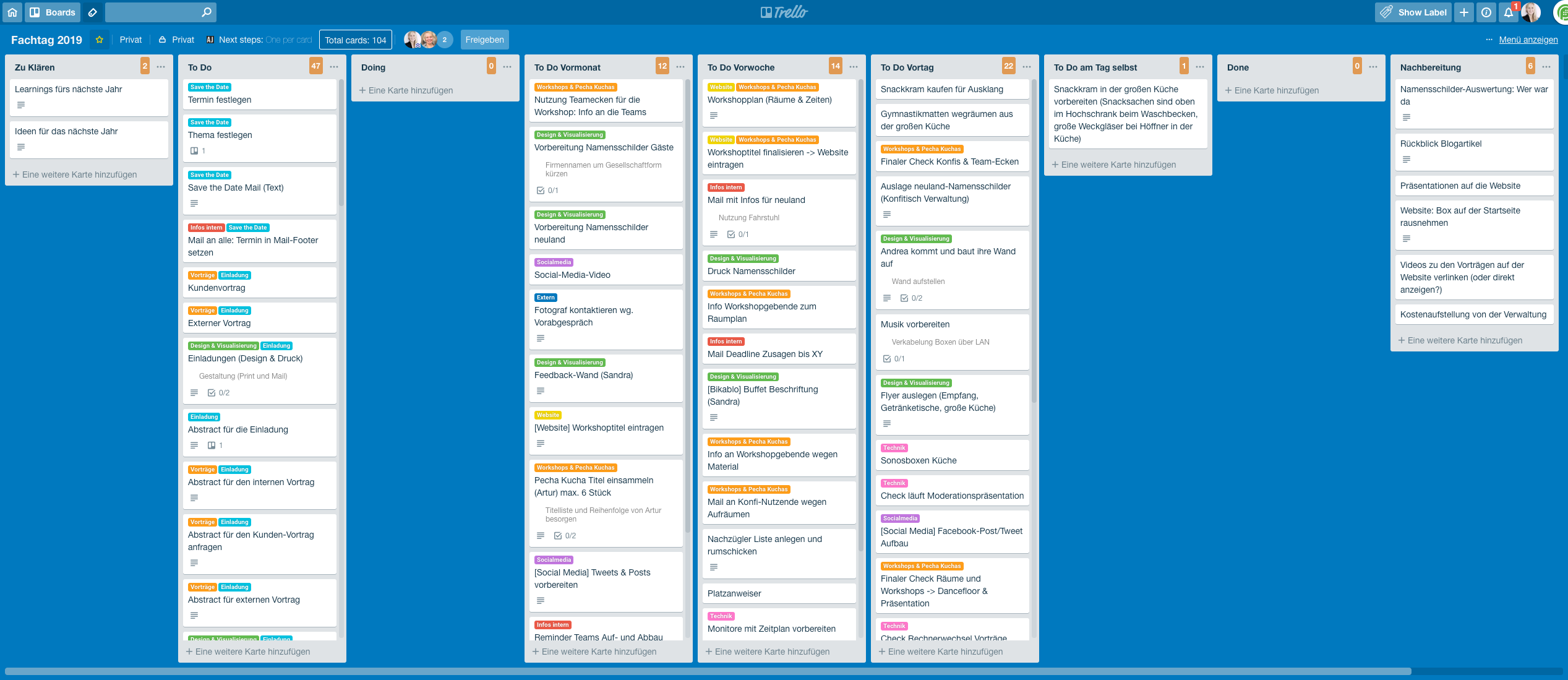 Für die Organisation des Fachtages arbeiten wir seit zwei Jahren mit einem Trello-Board. Wir sammeln hier alle Aufgaben. Da diese sich jedes Jahr ähneln, kopieren wir das Board aus dem Vorjahr und verteilen die fertigen Aufgaben wieder auf die Spalten. Die Listen ändern sich im Laufe der Planungsphase. Wir starten mit den Spalten Zu klären, To Do, Doing, To Do Vorwoche, To Do Vortag, To Do am Tag selbst, Done und Nachbereitung. Kurz vor der Veranstaltung kommen dann Spalten für jeden Tag der Fachtags-Woche dazu, die Liste "To Do" löst sich damit dann auf. Jede Spalte, die wir nicht mehr brauchen, wird direkt entfernt. Wir versuchen, die Aufgaben möglichst klein zu halten und den Titel so zu formulieren, dass dieser bereits alle Infos enthält und man nur für Details auf den Karteninhalt schauen muss.
