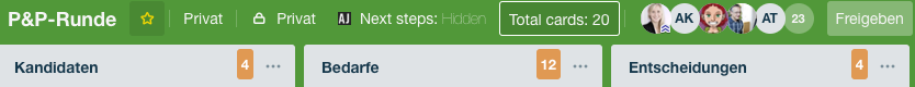 Alle vier Wochen treffen sich die Teamverantwortlichen mit der Unternehmensleitung und besprechen sich zu aktuellen Entwicklungen beim Kunden, aber vor allem zu den Themen freie Stellen, Wechselwünsche und neue Mitarbeitende. Auch hierfür nutzen wir ein Trello-Board. Es hat lediglich die Spalten Kandidaten, Bedarfe und Entscheidungen. Vor dem Meeting pflegen alle Teams ihre Infos in das Board ein, und während des Meetings wird die Spalte Entscheidungen befüllt. Ein Screenshot des Boards dient als Dokumentation und Info für alle Kolleginnen, die nicht teilnehmen konnten. Ein Screenshot der Spalte "Bedarfe" wird genutzt, um alle neuländerinnen über den aktuellen Stand im Anschluss an das Meeting zu informieren. Da hier sensible und personenbezogene Daten enthalten sind, haben nur die Teilnehmenden der Projekte- und Personenrunde Zugang zu dem Board.
