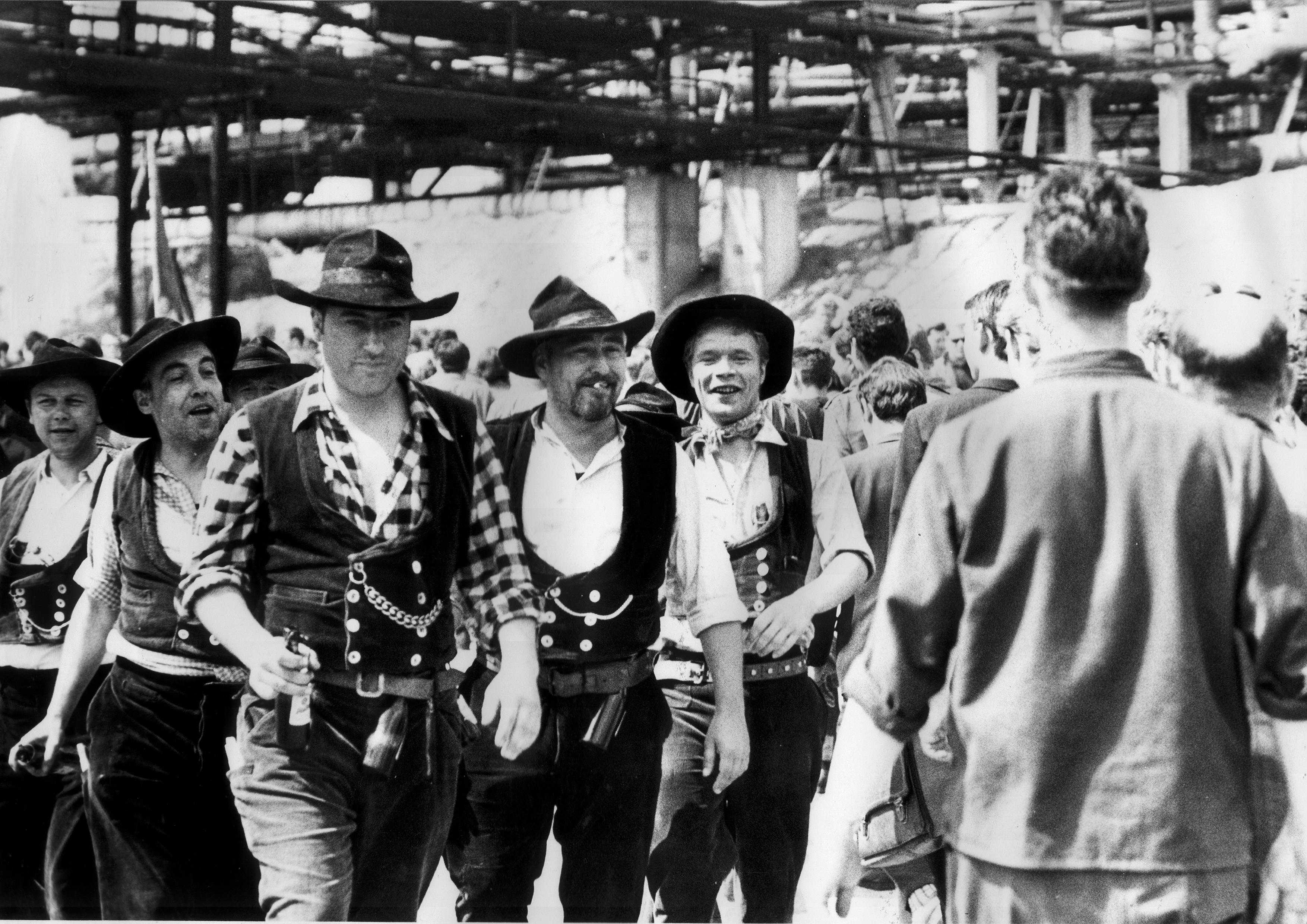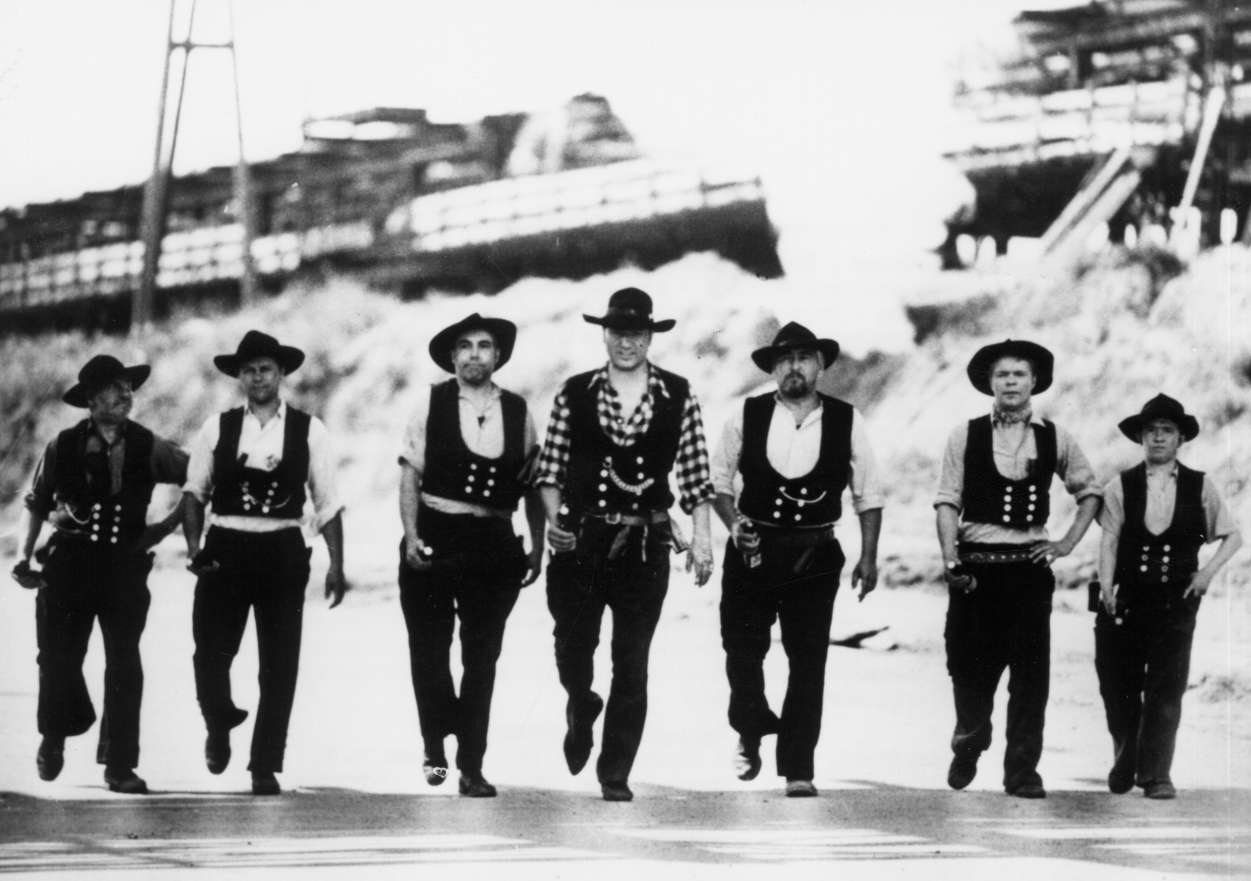 Sieben Kerle kommen auf den Betrachter zu. Frontal. Kerlhafte Kerle. In Zimmermannskluft. Im Schiebergang. Die Gruppe bewegt sich - ohne Hast, aber mit einer subtilen Kraft. Ein, zwei der sieben Männer scheinen kurz vor einem Tanz, vielleicht einem Hüpfer oder einem Stepmove. Auf jeden Fall gibt es keinen Gleichschritt - und das wäre auch heute schon mal beruhigend. Die Aufstellung in einer unfertig staubigen Kulisse, eine Dampfwolke steigt im Hintergrund vor einer Konstruktion (aus Holz oder Metall?) auf. Das optische Zitat könnte sich auf die glorreichen Sieben beziehen, oder vielleicht sogar das Original der sieben Samurai.